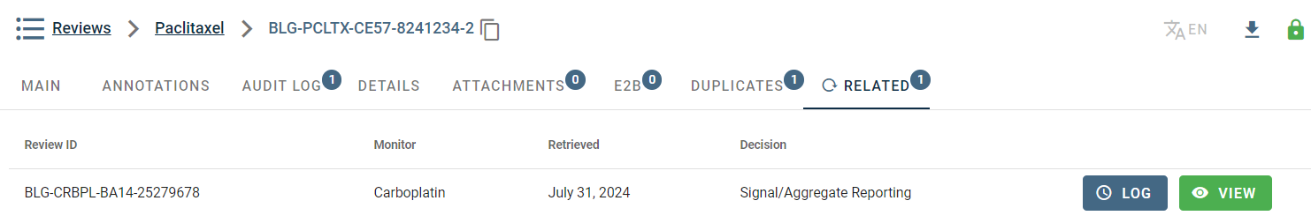 Alternatively the "Related" tab presents details of the related article, including the review ID and recorded decision (if any), with links to navigate to the article.