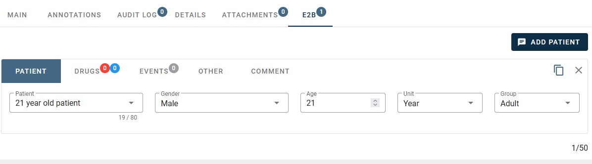 Once enabled, a new "E2B" tab is shown in the [Article Details](https://docs.biologit.com/application/article-screening#e2b) screen allowing users to add case details to fields expected by the E2B standard. The E2B tab is itself a tabbed view where the fields correspond to E2B elements in the exported XML file (see below for a mapping of each field in the R2 and R3 versions).